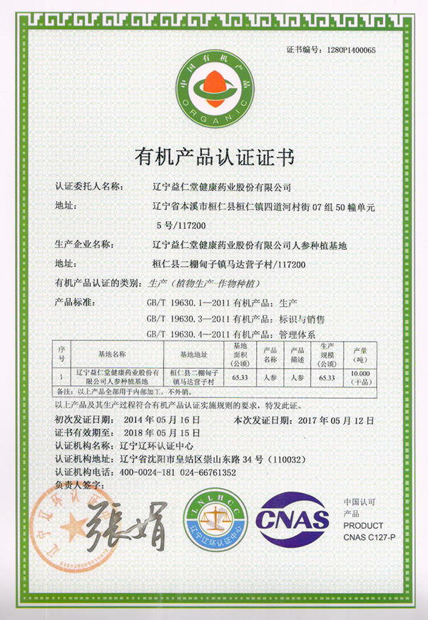 有機(jī)人參認(rèn)證證書(shū)