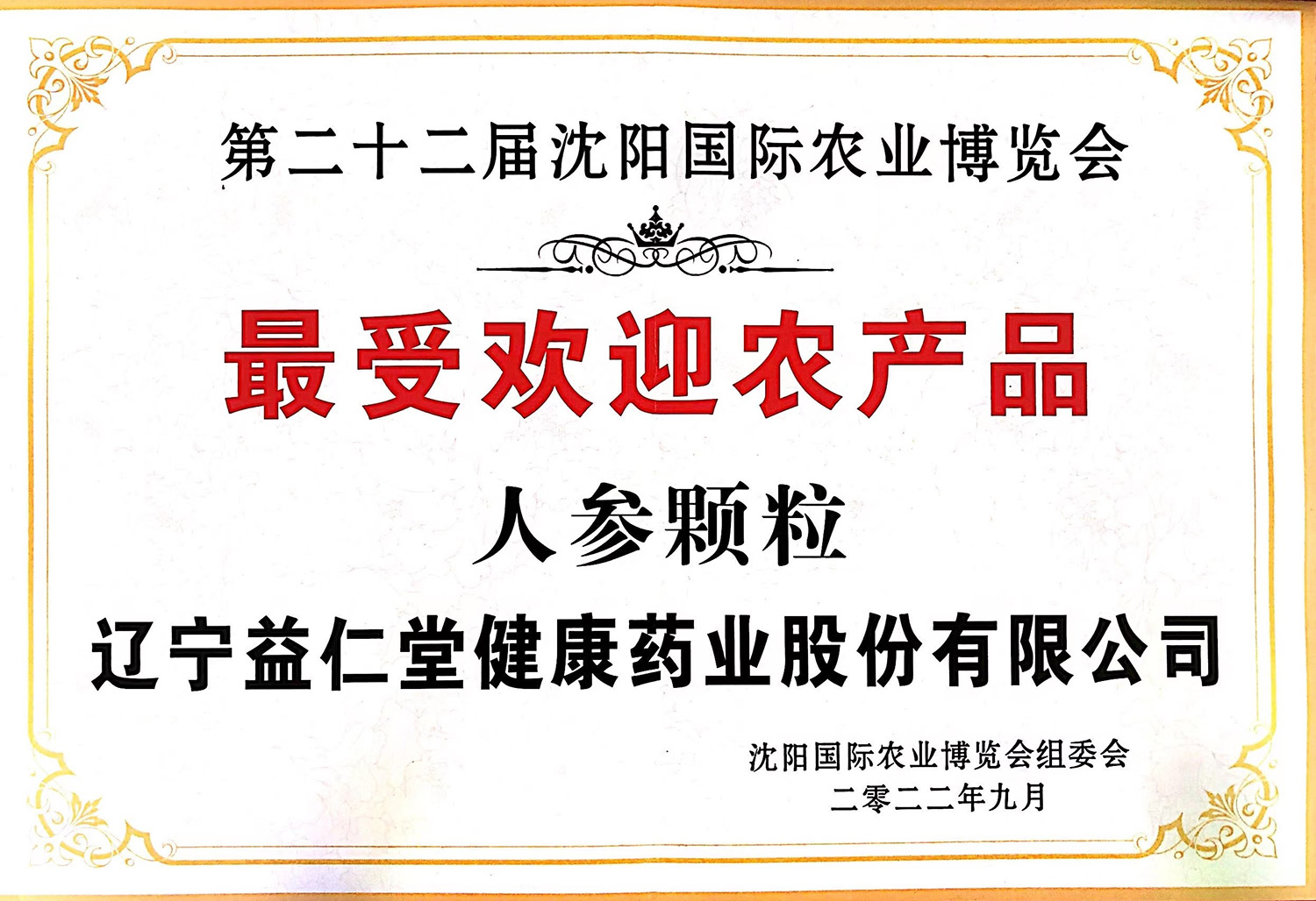 公司參加第二十二屆沈陽國際農業(yè)博覽會,我公司產品野山籽海牌人參顆粒榮獲最受歡迎農產品獎項