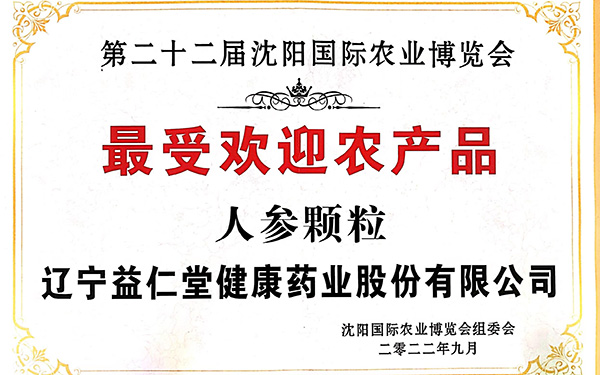 公司參加第二十二屆沈陽國際農(nóng)業(yè)博覽會(huì),我公司產(chǎn)品野山籽海牌人參顆粒榮獲最受歡迎農(nóng)產(chǎn)品獎(jiǎng)項(xiàng)